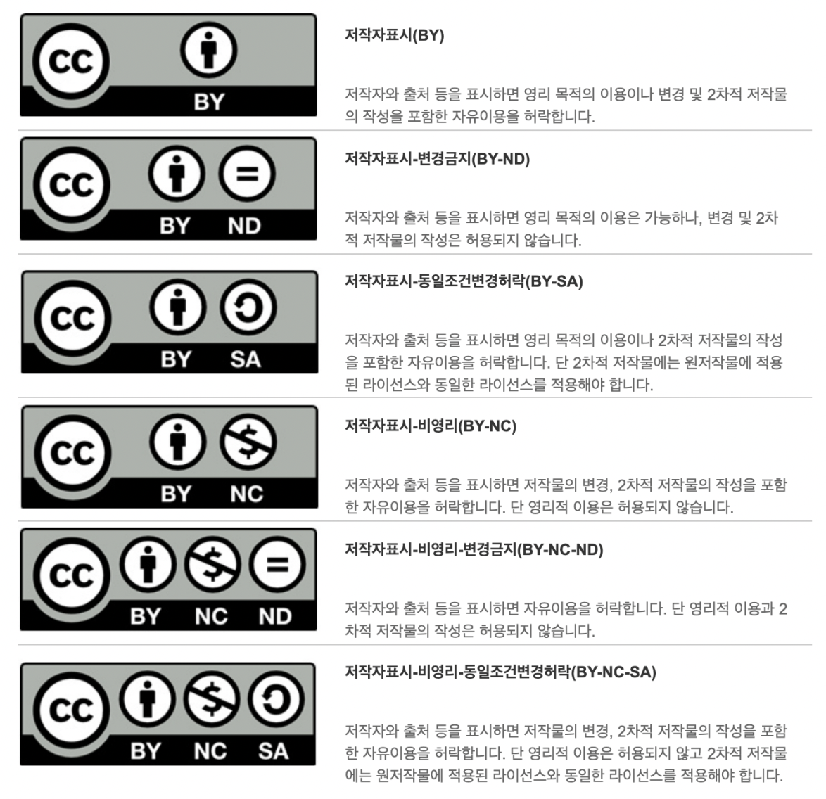 - 라이센스 : 저작자에게 이용 허가 요청을 하지 않아도 저작자가 제안한 특정 조건을 만족하면 이용이 가능하도록 만든 저작물에 대한 이용허락 규약. CCL(Creative Commons License)이 가장 대표적이다.