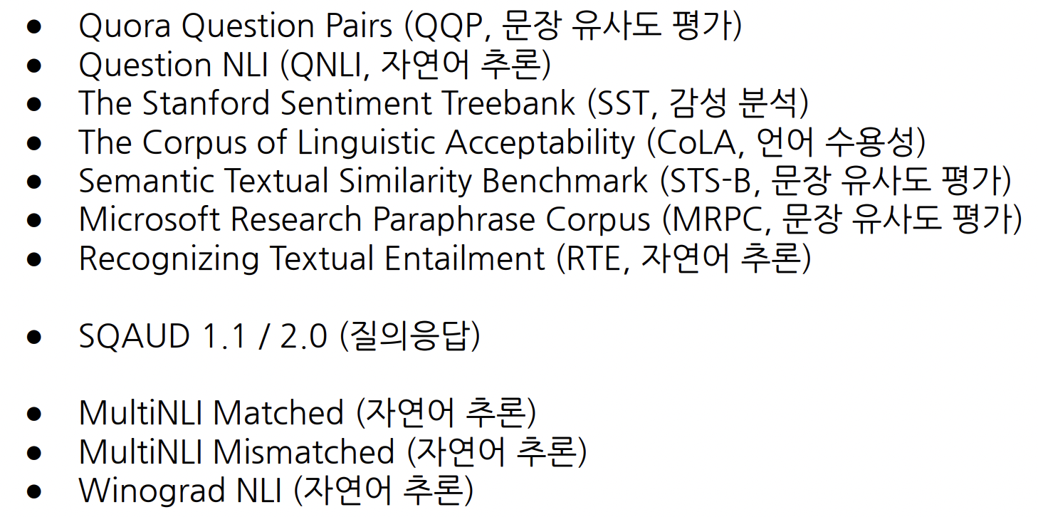 GLUE : 언어 모델을 위한 영어 벤치마크로 자연어 생성 모델의 평가에 활용된다. RoBERTa, ELECTRA, ALBERT 등의 성능이 BERT보다 뛰어난 자연어 이해 모델 등장의 계기가 되었다. 한국어 자연어 이해 벤치마크로는 국내 연구진이 KLUE를 개발하였다.